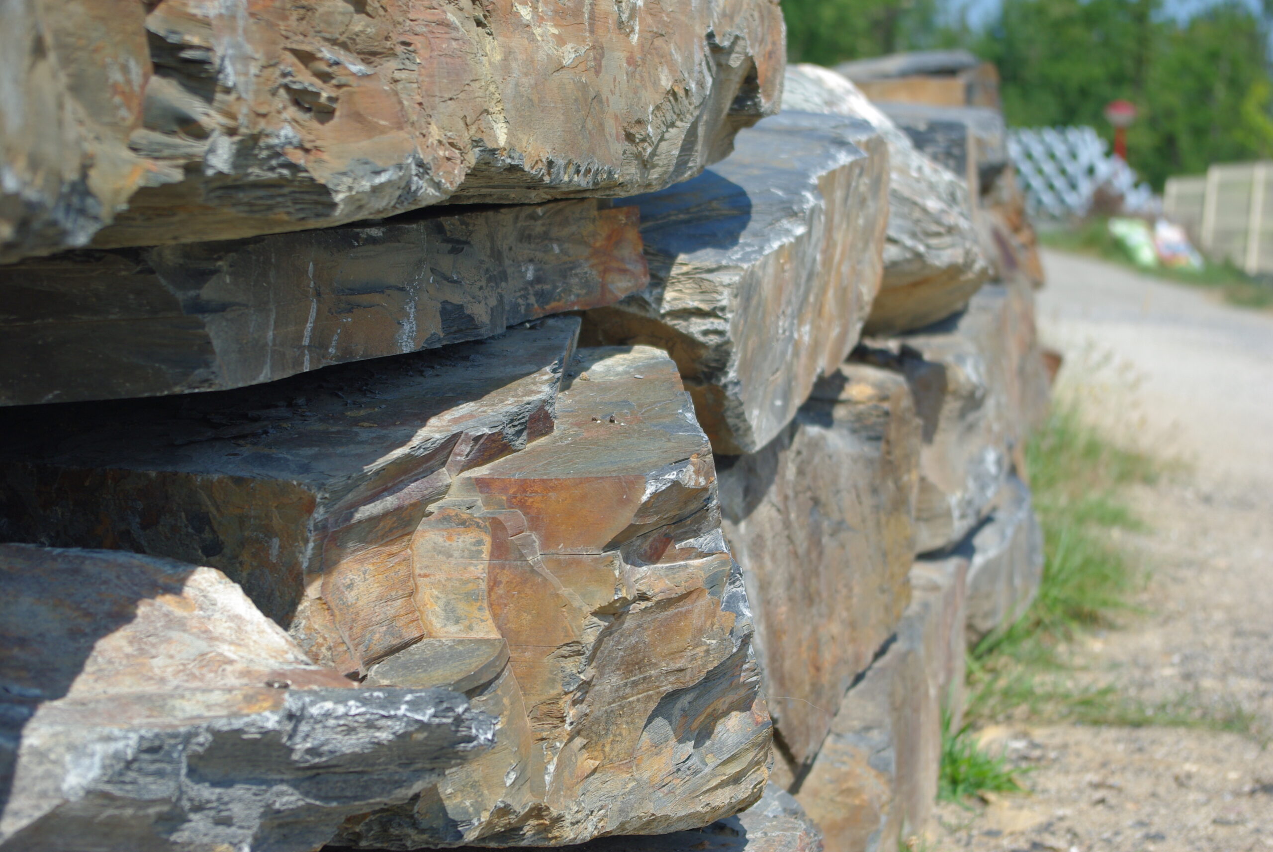 Les rochers ardoise Filita se caractérisent par leurs teintes gris bleuté ou multicolores, mêlant nuances minérales naturelles visibles en surface.