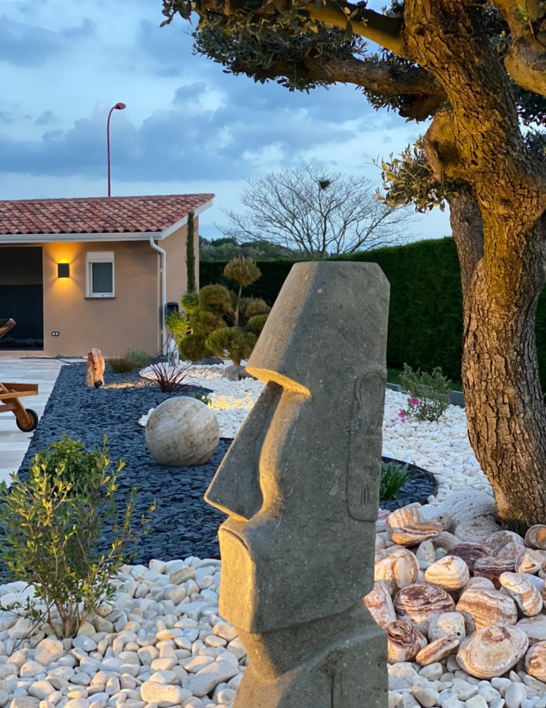 Statue jardin zen moaï visage allongé en béton
