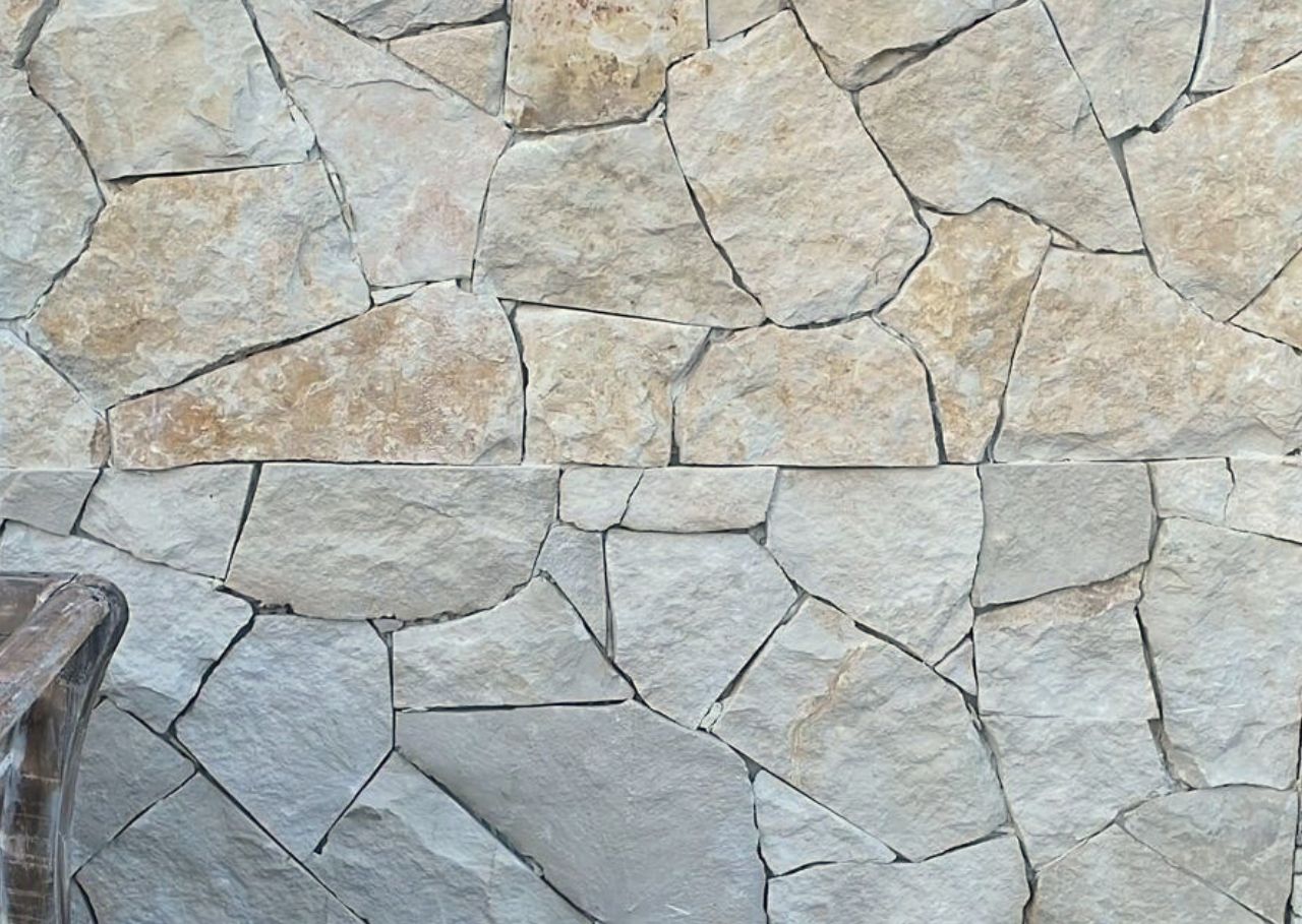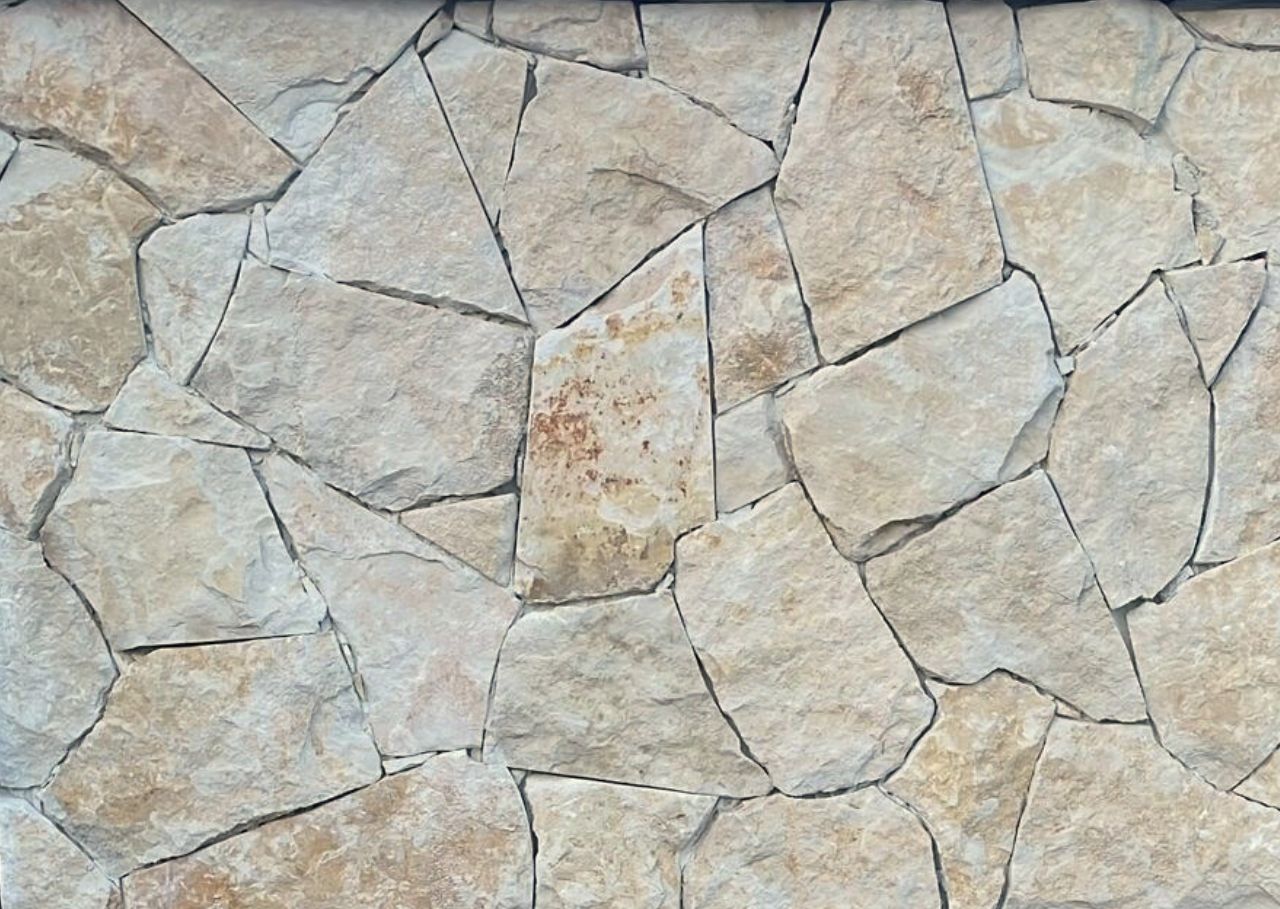 La pierre à bâtir rock face jaune ou beige se distingue par son relief marqué et son aspect brut.